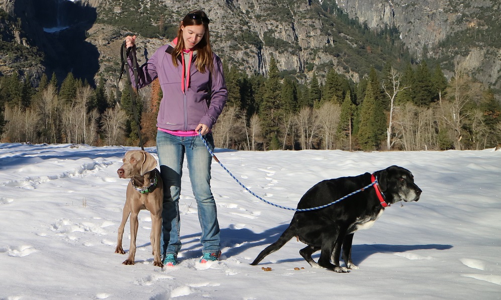 This is especially entertaining (I’m sure) when someone decides to let their dog barge up to us as I’m bent over trying to pick up poop with one hand while holding two leashes in the other.