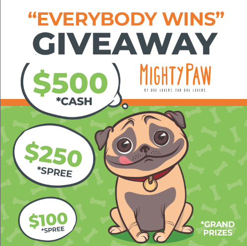 The three grand prizes are $500 cash, a $250 Mighty Paw shopping spree and a $100 Mighty Paw shopping spree!