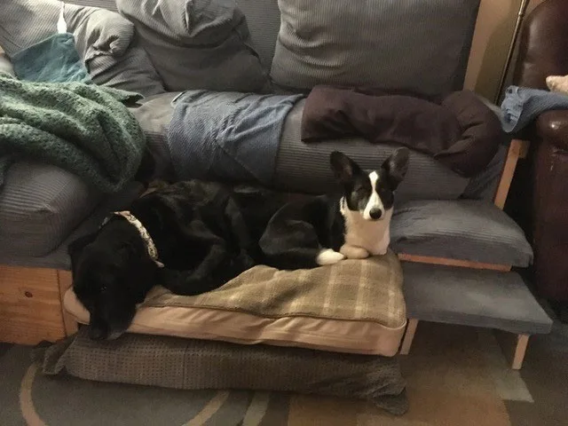 Guide dog Tom and the black and white Corgi, Zora, lie together on a dog bed