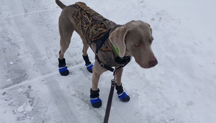 A thin pair of dog boots is enough protection to keep the snow and ice from gathering between your dog’s toes. The lighter the boots, the better. Remember, they’re not necessarily for warmth. And dogs really don’t like to have anything on their feet. See the Pawz boots below!